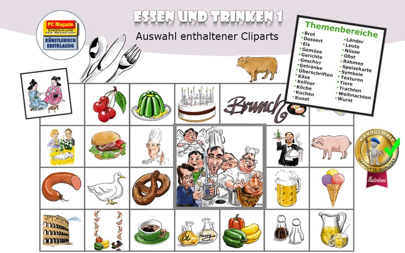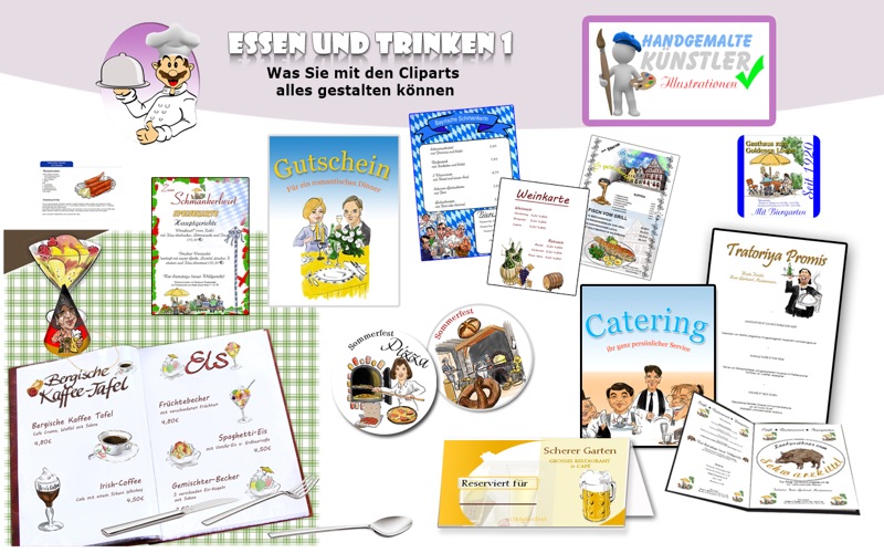 Gestalten Sie professionelle Speisekarten, Getränkekarten, Tischaufsteller, Einladungen, Grusskarten, Briefpapier, Etiketten, E-Mails, Webseiten und vieles mehr mit hunderten von Künstler-Illustrationen auf Ihrem PC