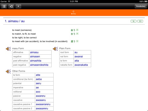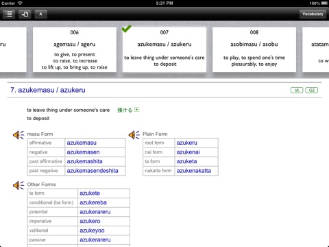Essential Japanese Verbs contains three versions using Romaji, Kana and Kanji.