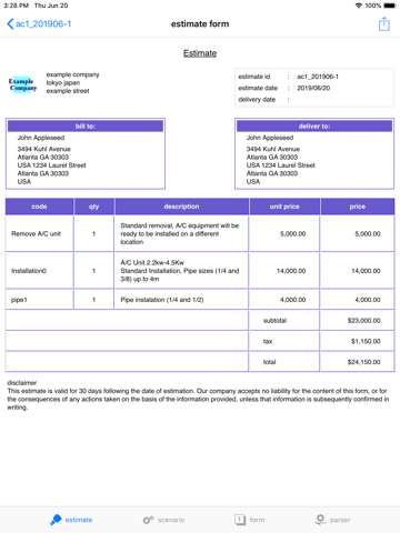 Created estimate can be send to customer as a pdf document of professional format.