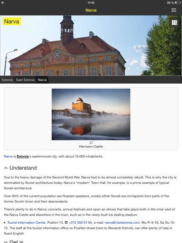 Estonia GuideWithMe is an offline travel guide, which recommends detailed articles around the country in relation to your current location. Developed by travelers and for travelers, GuideWithMe is a rich source of general travel info as well as off the beaten track advice.