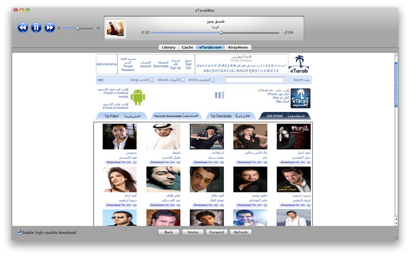 Welcome to the easiest way to get, organize, and listen to your Arabic music collection off-line. This eTarab jukebox will build up your library of songs and PlayLists using the #1 Arabic online music store.