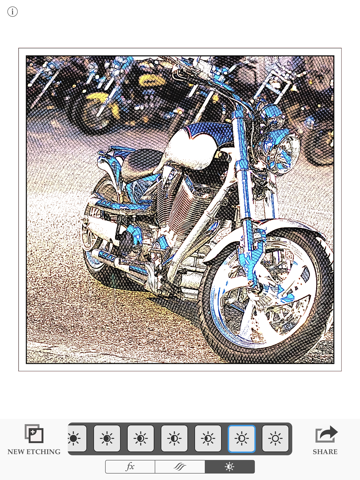 This app quickly and straightforwardly transforms photos into engraving/etching-like renderings. Thats exactly what I want it for. Some complain that it isnt creative enough. Actually, I would prefer that the app not add anything beyond basic stylistic rendering. Let the user add any "creative" imagery in GIMP or Photoshop. A couple of included styles already add such flourishes, like fake currency or rubber stamp marks--I doubt Ill ever use those. Im hoping the developer provides new style packs with additional effects such as mezzotints, aquatint, and other intaglio and lithographic techniques.