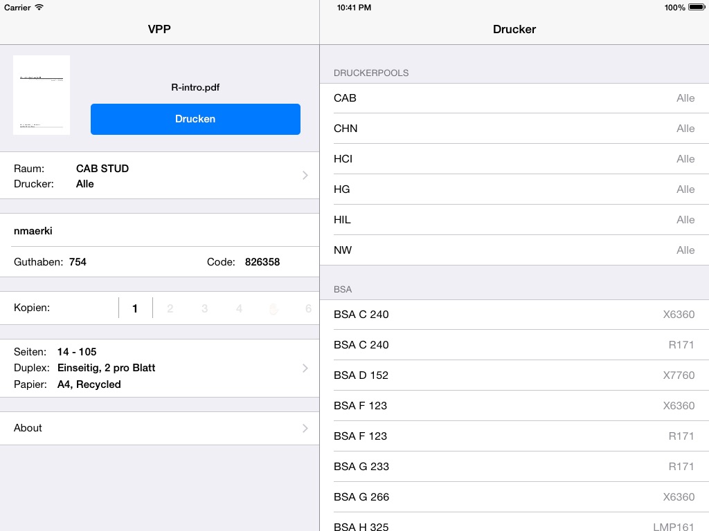 In beliebigen Anwendungen (z.B. Mail, Safari) PDF-Dateien öffnen und direkt an einen Drucker der ETH Zürich senden.