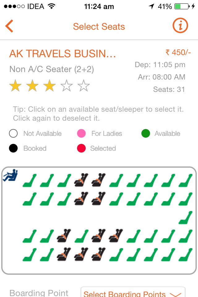 Our "Smart" technology helps passengers book bus ticket online among all famous destinations across India with just few simple clicks.Passengers are able to find a wide range of Smart filters which enable them choose Bus operators (SVR,VRL,Orange tours and travels,SRS,KPN, Neeta Travels, Kallada, Kesineni, Sharma Travels, HKB, Sangeetha, SRM, Seabird, Hindusthan,KALESWARI TRAVELS, Paulo, Rathimeena, Sharma, Sree Kaleswari, Universal, Kaveri, Morning star, Greenline, Prasanna,Uttar Pradesh State Road Transport Corporation(UPSRTC), Hebron, Hans, Vivegam, National, A1, Roadlink, Meghana, Patel, Konduskar, Jabbar & many more), Type of Bus (seater, sleeper, semi-sleeper,A/C, Non A/C, and Volvo), Ticket Fares, Boarding Points, Dropping Points, etc.