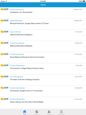 SAM provides open, standardised ways of characterising, discovering and syndicating media content items interactively. Users will be able to consume and prosume media content from different syndicated sources, using different synchronised devices, ranging from tablets, phablets and smartphones to notebooks and connected TV sets. With SAM content providers can create richer, enhanced experiences around original media content items such as television programming, TV shows and on-demand video.