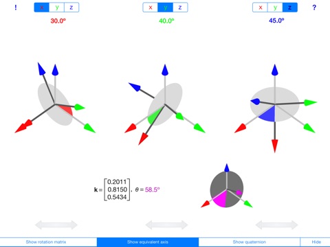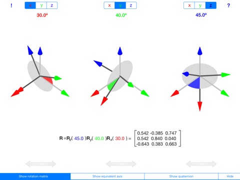 EulerAngles is an interactive tool for learning about Euler angles and other 3D orientations, such as rotation matrix, equivalent axis, and quaternion. The Euler convention can be easily changed by touching the top bar. The three angles can be modified simply by editing their values or by dragging. Simultaneously, a 3D animation of the three frames is shown while the angles are being modified. The rotation matrix, the equivalent axis, or the quaternion can be shown one at a time, along with the Euler angle frames. The viewpoint can also be modified through simple gestures.