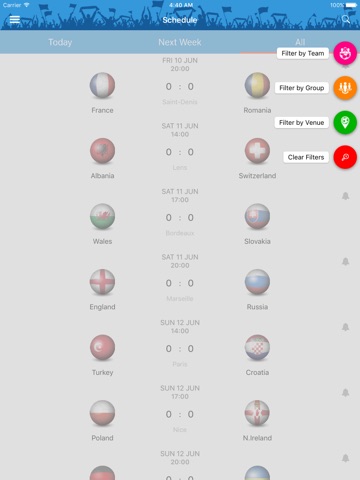 Select your home team to see their details in your home view, or look at the Schedule to see all matches happening today, in the next week and all matches.