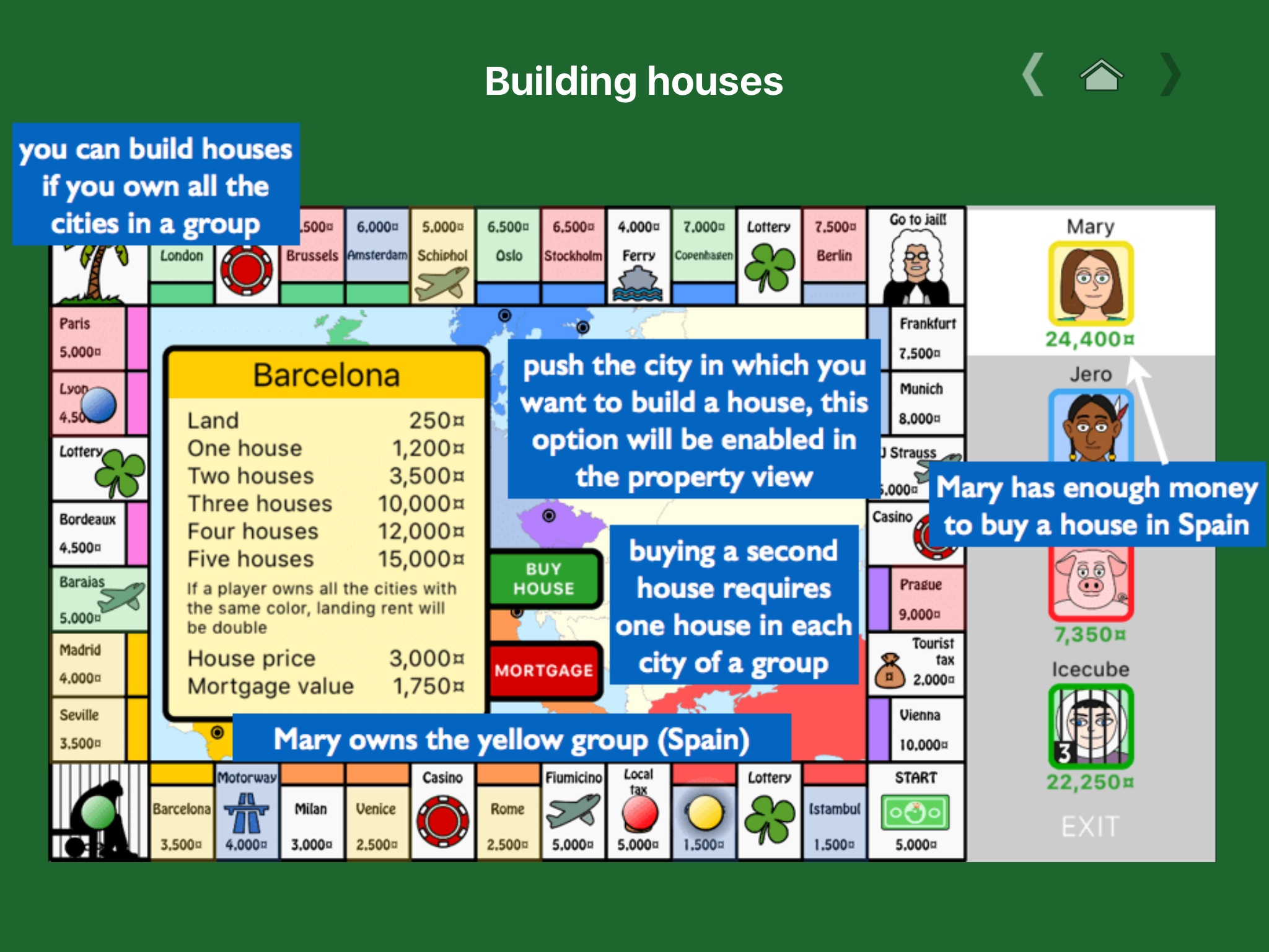 Cities are arranged in groups with the same color. The player who owns all the cities of a group has a monopoly and will be allowed to build houses, increasing the rent that is received. Transport squares cannot be developed, but the given rent increases if a player owns more than one of either type.