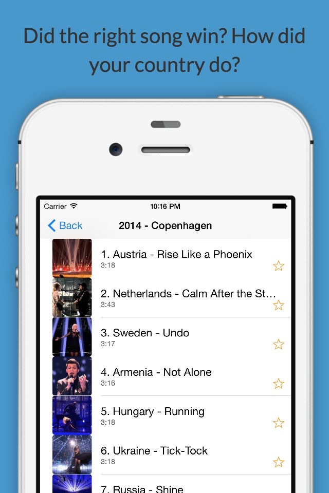 Eurovision Song Contest (ESC) is one of the most popular TV events in the world with 100+ million viewers every year. In this app you can relive the greatest moments of ESC history by browsing through a big video archive of great performances in the history of Eurovision Song Contest.