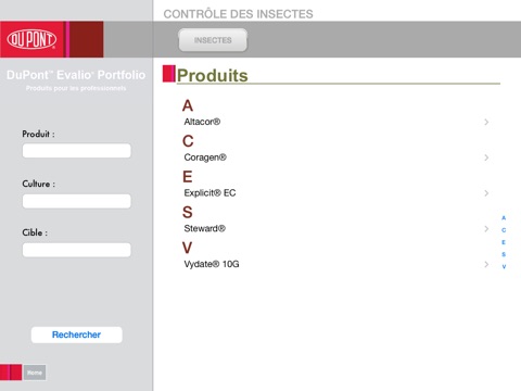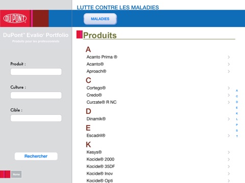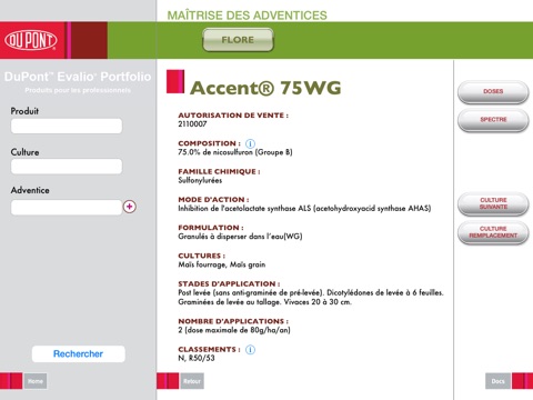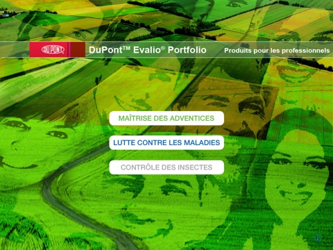 L’application DuPontTM Evalio® Portfolio est à destination des professionnels de l’agriculture. Cette application facilite le choix et l’utilisation des produits phytosanitaires de DuPont. Il est possible d’accéder à toutes les informations concernant un produit de DuPont : composition, usages, doses recommandées, données de logistique … Une bibliothèque numérique permet également d’accéder à la documentation illustrée sur les produits, ainsi qu’à une flore, une base insectes et une base maladies. Autonome, rapide et complète, cette application s’adresse en priorité aux prescripteurs et conseillers techniques, ainsi qu’aux utilisateurs des produits DuPont.
