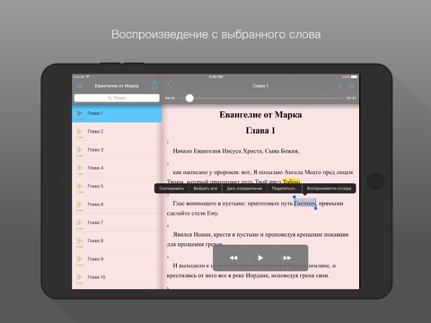 ・Воспроизведение с выбранного слова при помощи долгого касания;