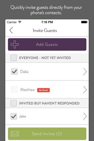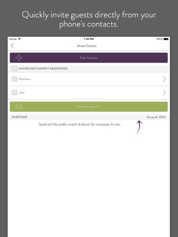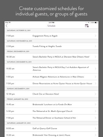 Plan like a pro from the palm of your hand! Create your event itinerary, organize guests in easy-to-manage groups and keep them in the loop with up-to-the-minute information. When you’re ready, send invites at the touch of a button! For guests, simply enter an Event ID and view the details of your upcoming events.