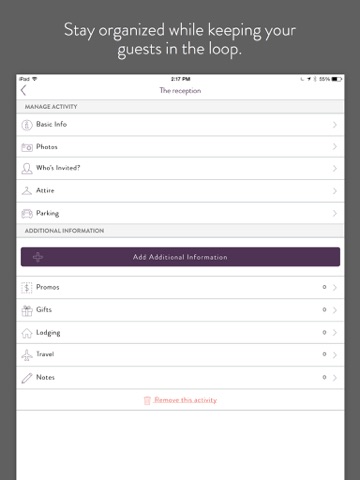 • Additional Information - easily add registry details, travel accommodations and more important info for your guests