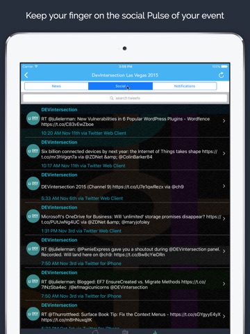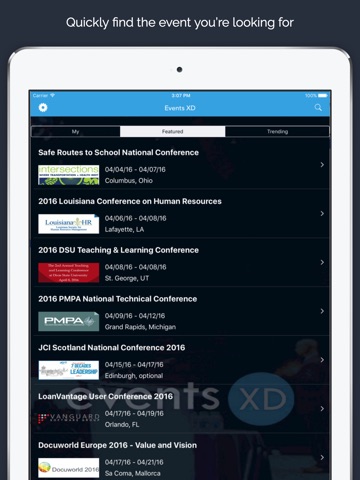 EventsXD allows you to view and search for event sessions by name, speaker, tracks, time slot, and keyword. EventsXD also provides access to other valuable event resources, such as maps, floor plans, news feeds, and conference web pages.