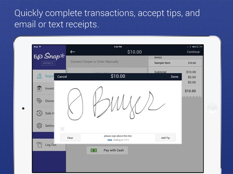 EVO Snap* Mobile is a complete mobile Point-of-Sale (mPOS) solution allowing small business owners to streamline sales and accept payments on-the-go with a smartphone or tablet device. Use your iOS device to process sales, apply discounts, calculate tips and taxes, email receipts and issue returns and refunds wirelessly. This solution is perfect for boutiques, coffee shops, independent stylists, contractors, daycare professionals, food trucks and more!