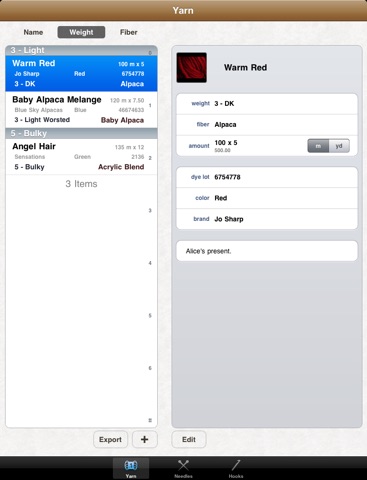 Ewe Stash makes it easy for you to add new yarn, needles, or hooks to your stash and sort those items so that you can find everything at a glance. To minimize typing, much of the data for your stash can be inputed using convenient lists and pickers. For the cases where you do have to type, Ewe Stash can offer suggestions based on previous data. You wont have to keep typing the same things over and over again.