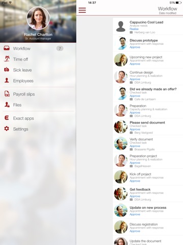 Whether you want to check your work, book a day off, check your latest salary slip, view your latest review from your personal files or look up the phone number of a colleague, the Exact Self Service App has it all. And for that one time that you’re sick, inform your manager via the App.