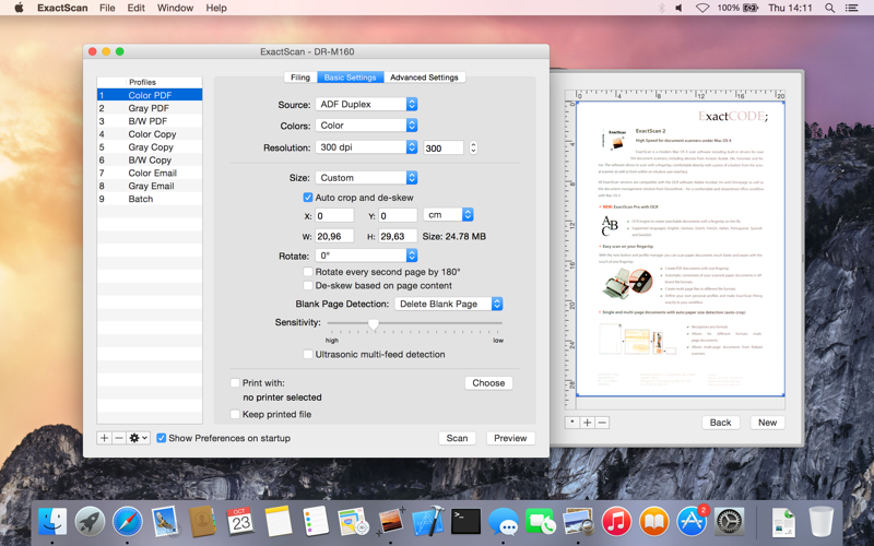 ExactScan is the professional scan suite for a paperless office on the Mac. Get organized and save time and money. ExactScan comes with over 400 drivers for PC document scanners from Avision, Canon DR-series, Fujitsu fi-series, Kodak, Oki, Panasonic, Visioneer and Xerox, which otherwise do not come with a Mac driver. Additionally it allows to use any other scanner with TWAIN or ImageCapture driver.