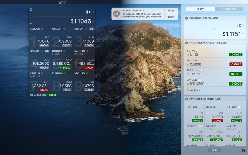 Exchange Rates is a convenient, versatile, and extensible currency calculator residing in the macOS status bar and supporting many cryptocurrencies – always available and always up to date. Nothing more, nothing less. It can also notify you automatically once an exchange rate crosses a certain threshold value and thereby help you to keep close tabs on the FX market. And if your brand new altcoin isnt being supported by Exchange Rates just yet, you can add it on your own – provided there is a publicly available JSON ticker feed around which the app can use in order to fetch the latest price.
