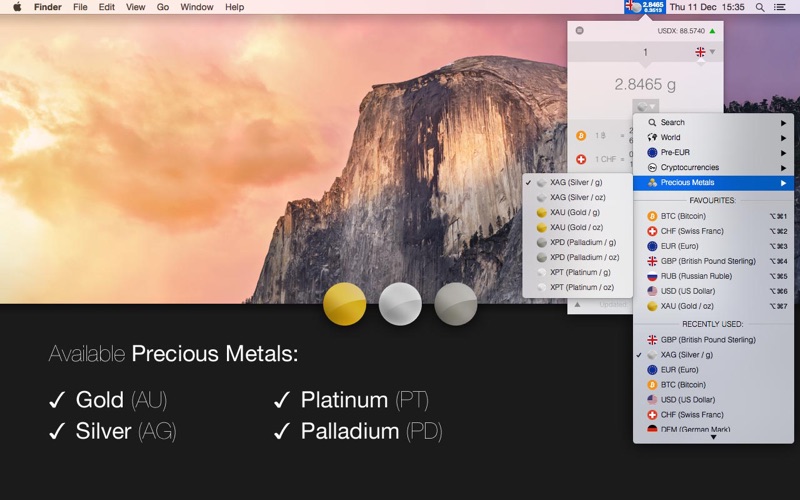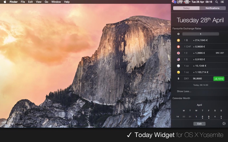 1. The colors & design are a bit odd for Yosemite. It could be refined. 2. The notification center doesn’t allow much. I would prefer not having the change in the (already pretty crowded) menu bar but rather in the notification center. Unfortunately, I can’t type a number (say $4000) and see the quotation in euro right next to it. And I would love to see this number persistent, of course.