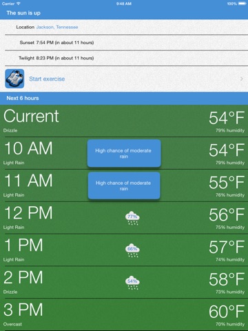 In order to make sure that you are properly dressed for your outdoor exercise the app uses your current location to get local weather forecast for the next 6 hours. Forecast data includes: predicted chance of rain, temperature, and heat index.
