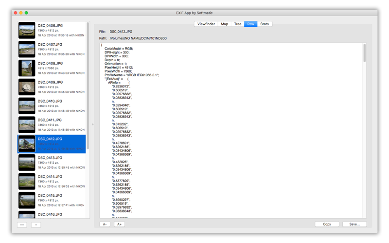 A raw data view of the EXIF data as it comes from the selected image. For further analysis the data can be written to a text file or copied to the clipboard.