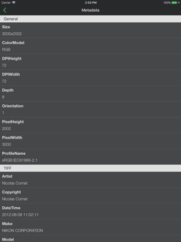 - Displays all available EXIF metadata: file size, time, location, camera, ISO, etc.