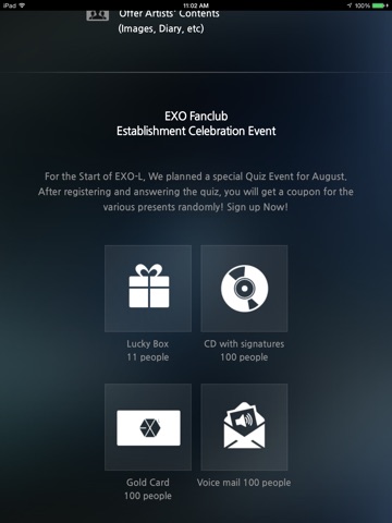 Hello, This is “EXO-L”, EXO’S GLOBAL OFFICAL FANCLUB. Sign up and finish a couple step-by-step missions to find huge benefits waiting for you. A mobile fanclub card, which can be used on various messages boards such as ‘Fan board’, ‘From Star’, etc, will be distributed to everyone who signs up. Install the application and join EXO-L.