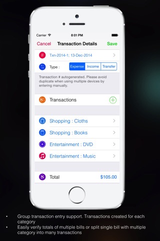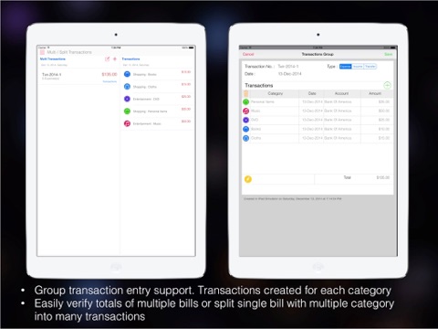 • It supports split transactions into category-wise, and multiple expenses in a group