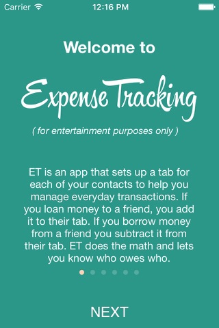 This app is great for roommates, poker nights, fantasy football, or anything else you can think of. Dont struggle to remember, use Expense Tracking to remember for you. The app sets up a tab(like a bar tab) for each of your contacts. If you loan a friend some cash, you put it on their tab. When your friend pays you back, take it off the tab. Simple.