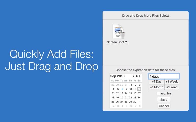 Homework assignments from last week taking space on your desktop? Old photos that you never got around to archiving? Never worry about a cluttered computer with Expiry! Expiry allows you to set an expiration date for selected files on your computer. When the date comes, the files will be deleted or archived so you don’t have to worry about them anymore.