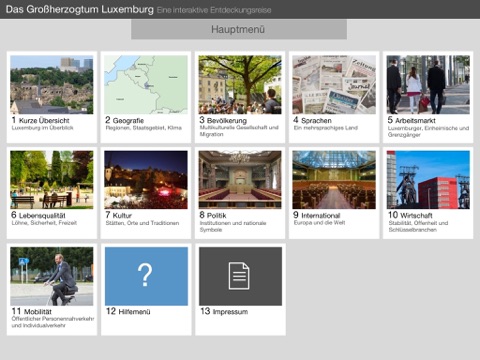 ExploringLux bietet einen breiten Überblick über das Großherzogtum Luxemburg. Kurze texte werden mit Fotos, Karten und interaktiven Graphen illustriert. Nach einem kurzen Zusammenfassung folgen Geographie, Bevölkerung (multikulturelle Bevölkerung und Migrationen) Sprachen, Arbeitsmarkt, Lebensqualität, Kultur in seinen vielfältigen Aspekten,politisches System, Europäische- und Außenpolitik, Wirtschaft und seine Schlüsselbranchen und abschließend Mobilität.