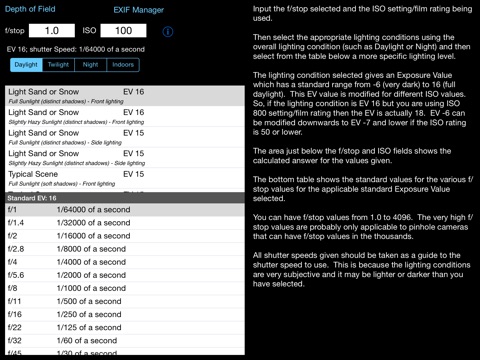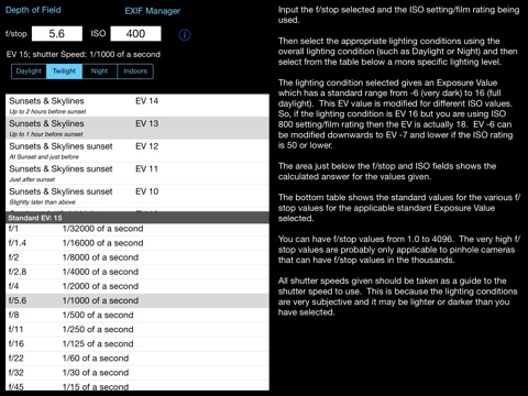This App takes this information and presents it in an easy to use form. Just type in the f/stop value using the keypad, type in the ISO rating using the keypad and then select the applicable lighting conditions from the four lighting condition types: Daylight, Twilight, Night and Indoors. Each has a range of Exposure Values to select from.