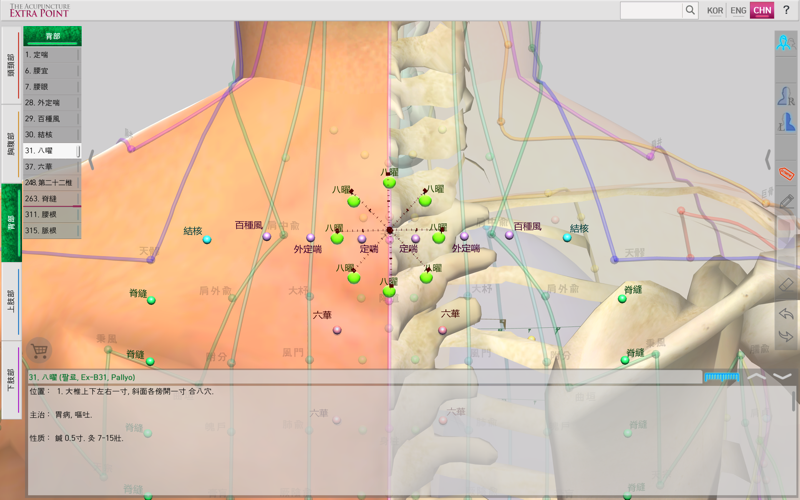 ‘The Acupuncture of Extra Point’ is easy to use because it displays The Extra Acupuncture Point on 3D human body model. As well, the Extra Acupuncture Point and 14 Main Acupuncture Point Meridians are displayed together with the accuracy, so you can easily compare.