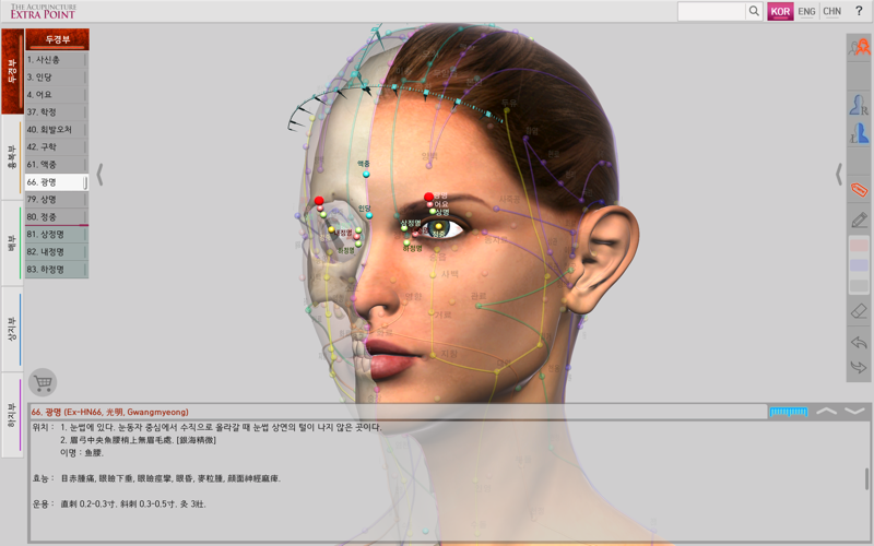 ‘The Acupuncture of Extra Point’ was created by integrating Extra Point from the past, and the newly discovered New Point together as one product. It allows for easy comparison because it expresses 14 Main Acupuncture Point Meridian and the Extra Acupuncture Point together in a male and female 3D model. Easily zoom in and out with multi-touch so you can see the exact location of The Acupuncture Point. It is recommended for people who want to see both 14 Main Acupuncture Point Meridian and the Extra Acupuncture Point at the same time. Contents include accurate location, based book, function and character (how to use). Released in Korean, Chinese and English, which allows it to be used across the world! With realistic skin, bone, and internal organs in 3D human body model, everything is distinguished by rich colors so it is very easy to see. It is based on The International Standard Acupuncture Points of WHO, WHO`s International Standard Terminologies on Traditional Medicine in The Western Pacific Region, The acupuncture textbooks of the university of Asian Medicine and Huangdi Neijing - Lingshu’. It is supervised by professors and Korean medical doctors from Korea Medical University. * 14 Main Acupuncture Point Meridian - 12 Main Acupuncture Point, Governor Vessel (GV) Acupuncture Point, Conception Vessel(CV) Acupuncture Point.- See The Meridian 2.0
