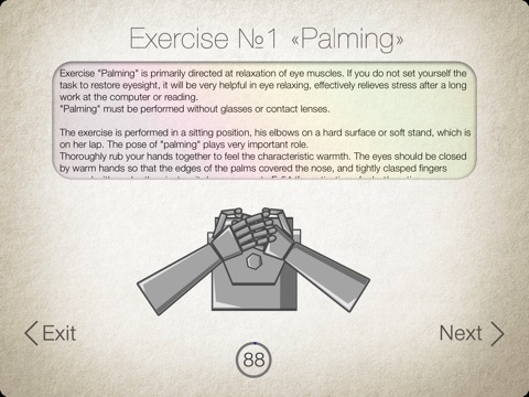 Over 100 years ago, an American scientist William Bates revised the theory of eye operation. His research showed that all eye problems are somehow related to the state of eye muscles. By wearing glasses to correct vision, some eye muscles remain overly-contracted, while the others become atrophied. However, using this app to exercise and strengthen the eye muscles can free you from needing glasses/corrective lenses at all! Improvements in vision may start after the first day’s exercise!
