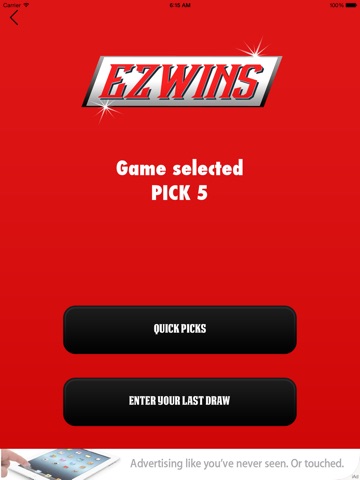 The EZ Wins Lotto app makes it easy to come up with the winning numbers.With this app you have the choice for generated random numbers or enter your last draw to get the best numbers to play. If you choose to enter your last draw, know that the numbers displayed by the app are not random numbers, but based on math formulas. If you prefer random numbers, just select "Quick Picks".