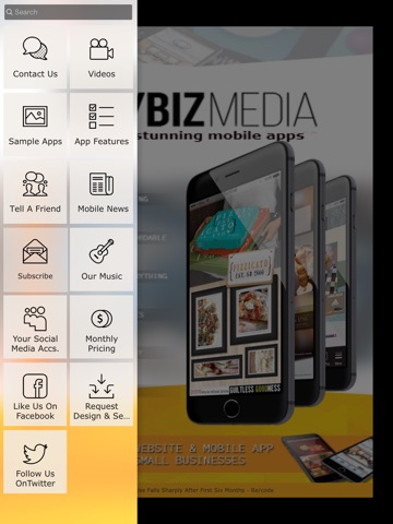 Our app shows you the features of our mobile app and mobile website platform, pricing for hosting, common FAQs, sample apps for different industry groups and explanatory videos.