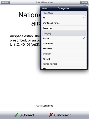 The terms can be browsed by book or by category—Private, Instrument, Advanced, Weather, Aircraft, Human Factors, Non-Airplane, and CFI. A quiz section lets you test your knowledge of random terms.