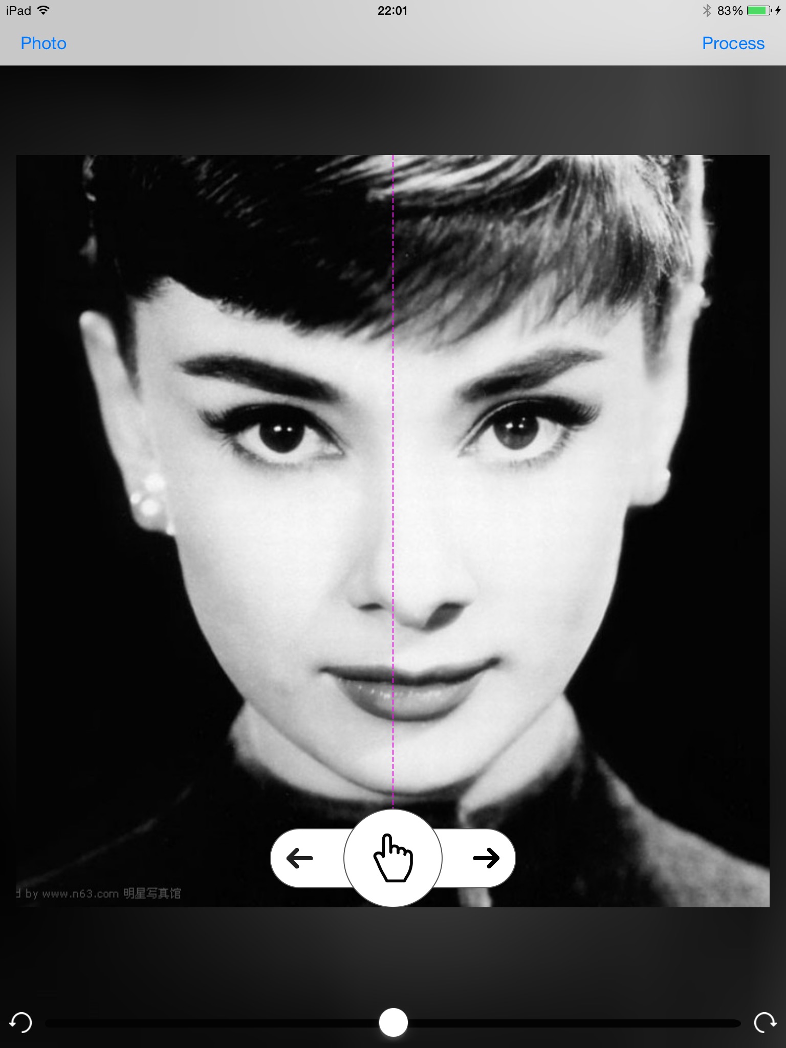 Select a front photo of you, and move the line in the exact middle of your face then process, you will see two different versions of you! It is said that a good looking person is one whose left part and right part look exactly the same. Dare to give yourself a try?