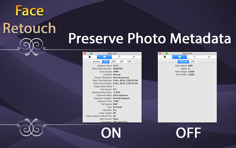 Preserve photo EXIF and IPTC metadata. Details such as camera model, keywords, GPS location and more can be preserved in the retouched photo with a simple check.