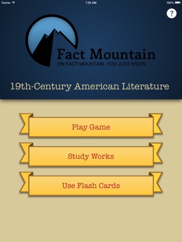 Select a flash card set, ranked from hardest (30) to easiest (1). Play the game, using only your chosen set of flash cards. Correct answers climb the Fact Mountain of 19th-century American literature!