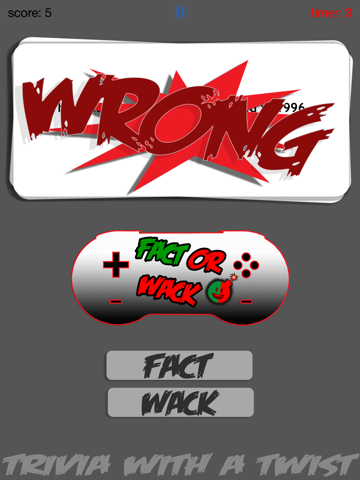 Trivia with a video game Twist! FACT OR WACK video games is the ultimate time attack trivia game with some surprises thrown in. Twelve challenging and hilarious levels, tons of questions, and no ads. Try your best to ace every question on each level while racing against the timer. Try to tackle a huge variety of game questions from classic video games all the way up to the present hits. To pass a level you have to get 100% and beat the timer. If youre fast and smart you just might survive!!!!