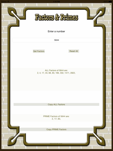 Factors & Primes iOS app by ManalSoft.com. An app for iPhone and iPads to produce the factors of any number consist of up to 5 digits. It has a "Get Factors" button, a reset button, and two buttons for copying the factors and the prime factors. If the user entered nothing and press the get button or enter more than 5 digits number, the app will give a warning message and reset the app.