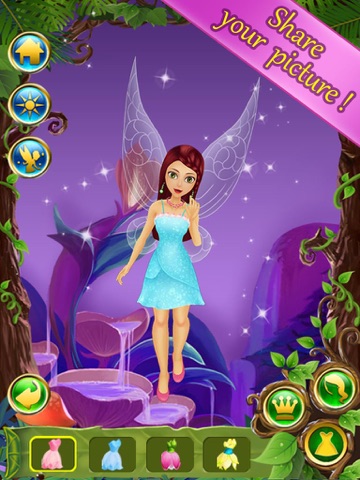 Your very own Fairy Princess! Change her hair! Choose her dress! Give her a crown fit for a princess and decorate her with jewelry! Choose from many wonderful and magical the backgrounds! Snap a picture and share it with your friends!