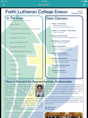 Newsletter: the Newsletter module allows Faith Lutheran College Plainlands to share electronic newsletters, directly to the app