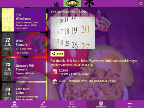 ABOUT US, a CALL NOW feature, DRIVING DIRECTIONS & MAP, our delicious MENU items, our daily CALENDAR so you can keep up with us, VIDEOS, PHOTOS, COUPONS, REVIEWS, and a link to our WEBSITE.