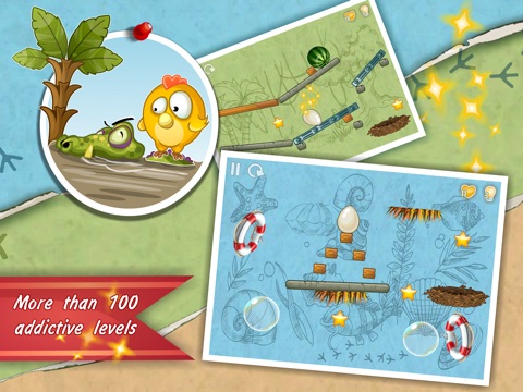 Help Chiki the chicken deliver the egg into the nest using all kinds of mechanical items which operate in accordance with physics, such as platforms, springs, floating bubbles, teleports, etc. Avoid obstacles and traps, gather gold stars, seek treats for Chiki and open new levels. Enjoy solving the exciting puzzles with Chiki!
