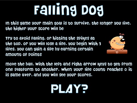 Falling Dog is a very interesting and addictive physics game. With your left and right controller you can move the main character of the game means the dog. Your job is to make sure that he stays on platform and dont fall. And also the platform is moving upward and there is a obstacle on the top. The fred dog should not hit that.