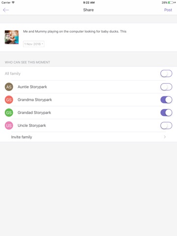 • Notify a family member, the whole family or your child’s educators when you’ve got something to share and they can respond with words or video messages.